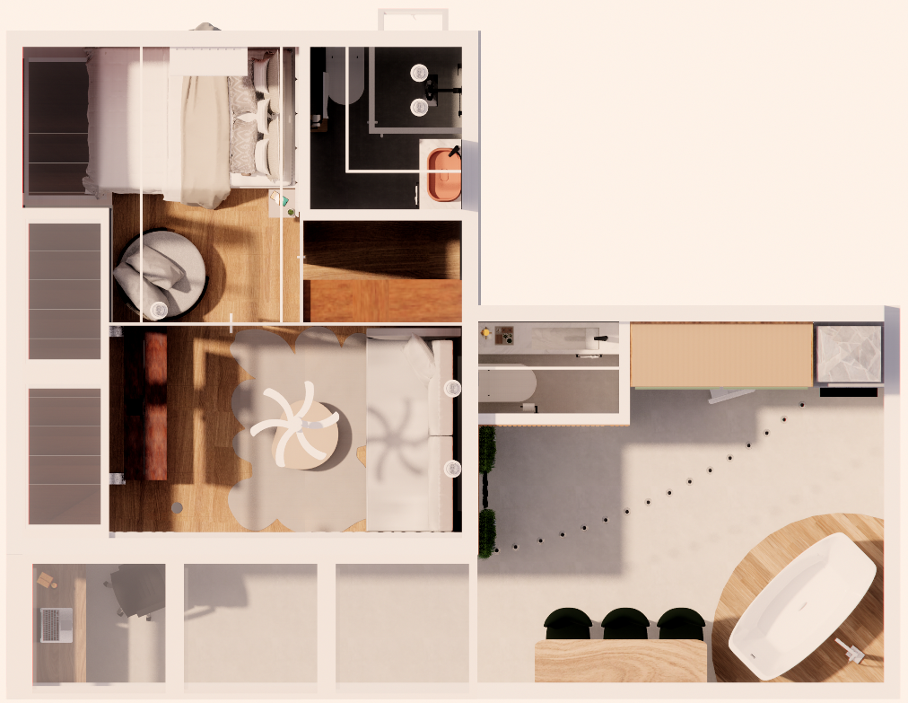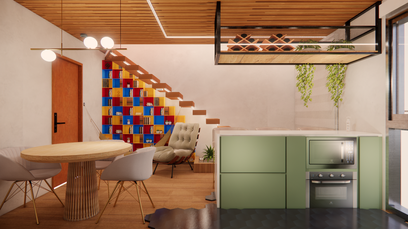 Planta baixa humanizada que evidencia integração e aproveitamento inteligente dos espaços. Sala e cozinha se conectam em um ambiente amplo e funcional, enquanto a escada em madeira se torna ponto de destaque, abrigando um charmoso espaço de leitura no vão, unindo estilo e conforto.