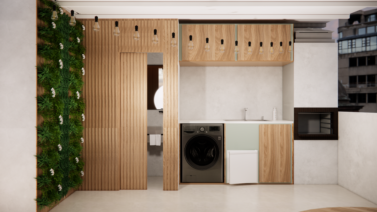 Área gourmet com área de serviço integrada, unindo praticidade e design. Acabamentos em madeira, parede verde e iluminação estratégica criam um ambiente acolhedor e sofisticado, ideal para receber e viver bem.