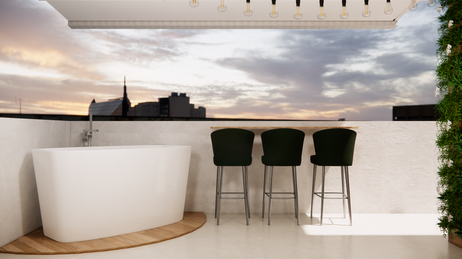A banheira de imersão com torneira misturador se destaca como ponto de relaxamento e estilo. O acabamento em MDF padrão louro-freijó, o varal de luzes e a prateleira suspensa com banqueta altas para refeições, criam um espaço acolhedor e multifuncional, perfeito para momentos especiais.
