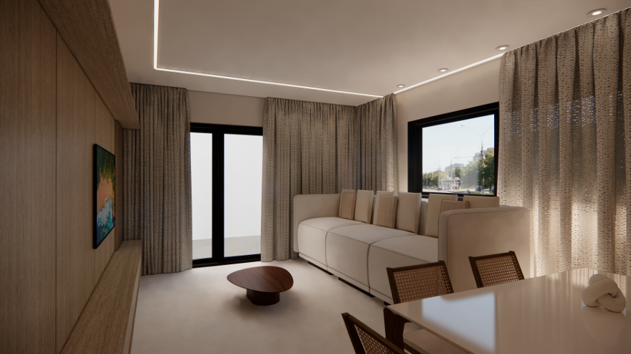 Ambiente pensado para unir conforto e sofisticação em uma paleta suave de nude, creme e carvalho. O painel em carvalho com porta oculta para o quarto casal traz funcionalidade discreta, enquanto o sofá amplo e a cortina piso ao teto garantem aconchego e elegância.