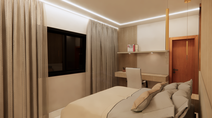 Quarto de casal em uma paleta suave de nude e tons neutros, com cama ampla e cabeceira em MDF que traz aconchego e estilo. O home office integrado é funcional e esteticamente harmonioso, também servindo como um espaço confortável para leitura e momentos de pausa.