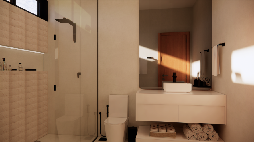 Banheiro com paleta suave e neutra, bancada branca e espelho do piso ao teto que ampliam a sensação de amplitude. Os acabamentos em preto adicionam um toque moderno e elegante, enquanto o projeto prioriza funcionalidade e conforto.