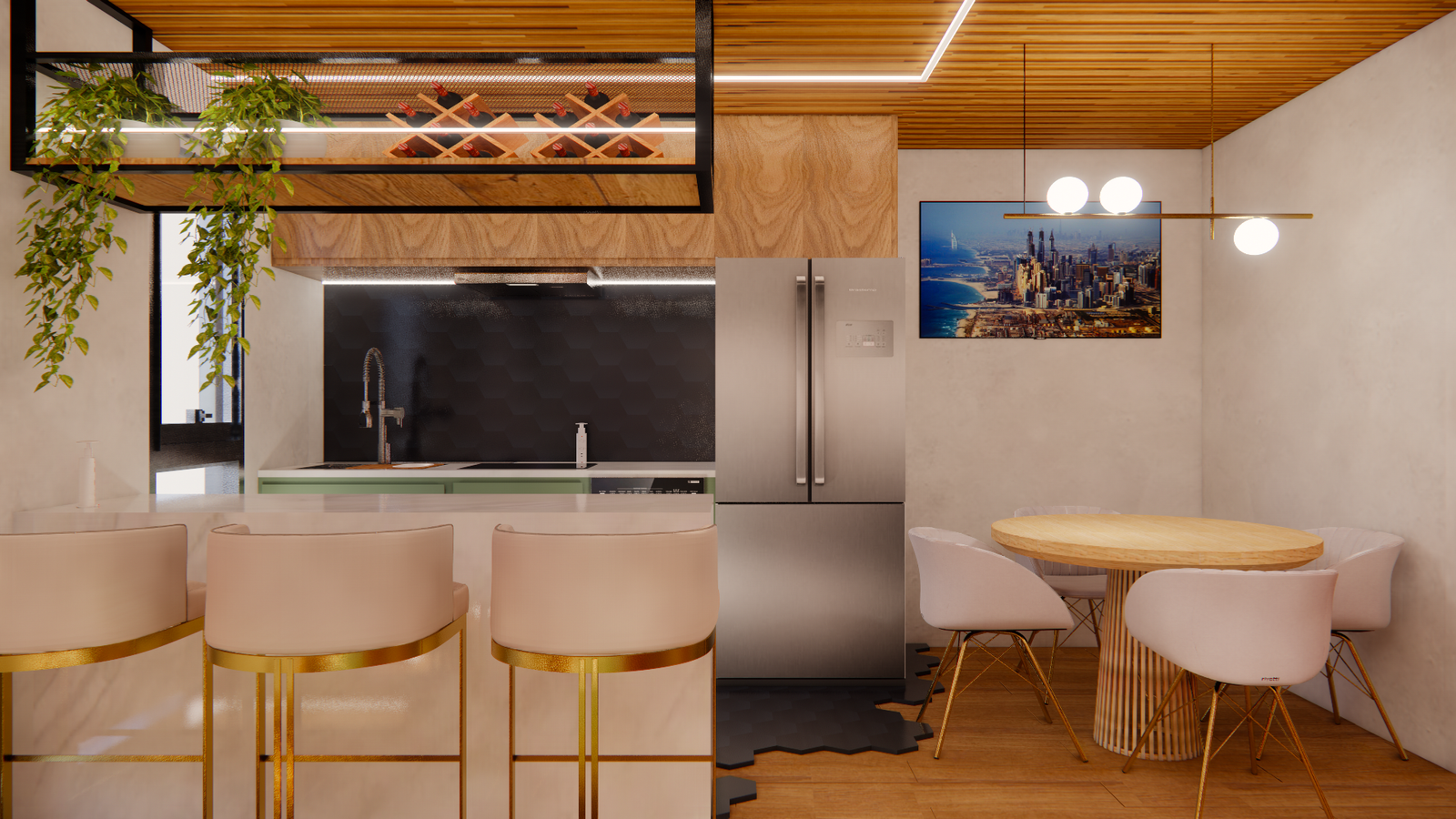 Uma área gourmet com atmosfera rústica e aconchegante, que combina perfeitamente elementos modernos para criar um espaço convidativo e funcional. Ideal para reunir família e amigos, o ambiente oferece conforto e praticidade, unindo lazer, convivência e elegância em cada detalhe.